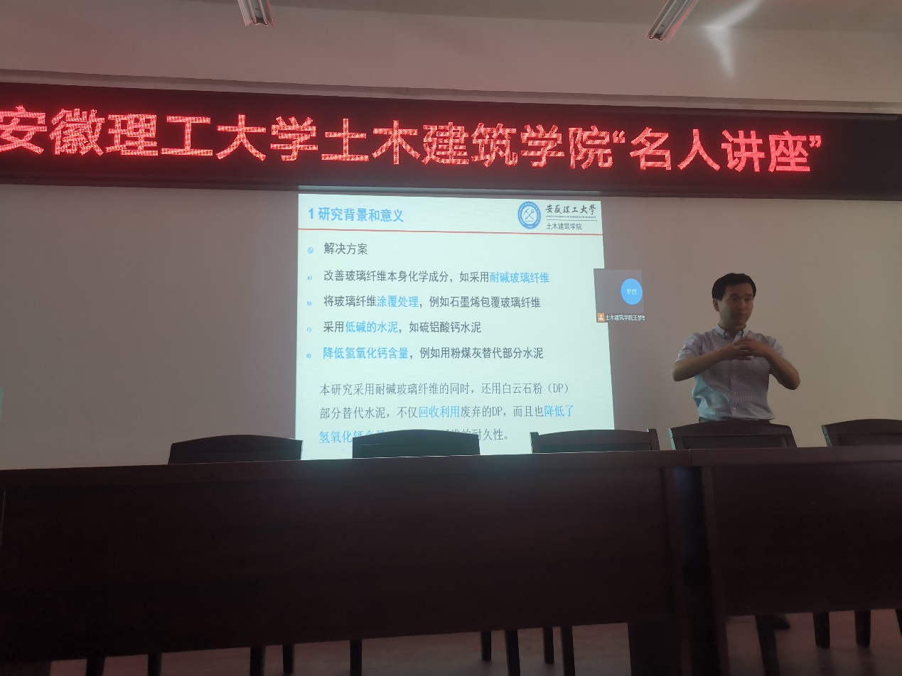 报告会上,陈海明博士针对玻璃纤维在碱性环境中易受腐蚀而降低玻璃纤维增强水泥复合材料(GFRC)的强度和耐久性的问题,以《白云石粉部分替代水泥对玻璃纤维砂浆的影响》为题,详细汇报了白云石粉(DP)含量(0%、5%、10%、15%和20%)对玻璃纤维砂浆(GFRM)流动性、抗压强度、抗弯强度、吸水率、干燥收缩率和微观结构影响的试验研究。研究结果表明,在GFRM中添加DP提高了GFRM的流动性、长期强度和耐久性,降低了GFRM的氯离子电通量、孔溶液的碱度和干缩,保护了玻璃纤维免受氢氧化钙的腐蚀。DP最佳含量为10%。在GFRC中加入DP有利于提高其性能,减少水泥消耗和二氧化碳排放,回收废DP和保护环境。